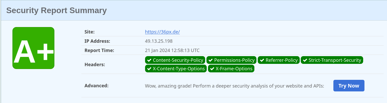 Die meisten Webseiten haben laut “securityheaders.com” ein “F” als Bewertung deren Header Parameter bekommen. Ich war einer von ihnen! Es ist allerdings einfach ein “A+” Ranking zu bekommen, dazu habe ich meine Caddy Konfiguration “Caddyfile” angepasst.